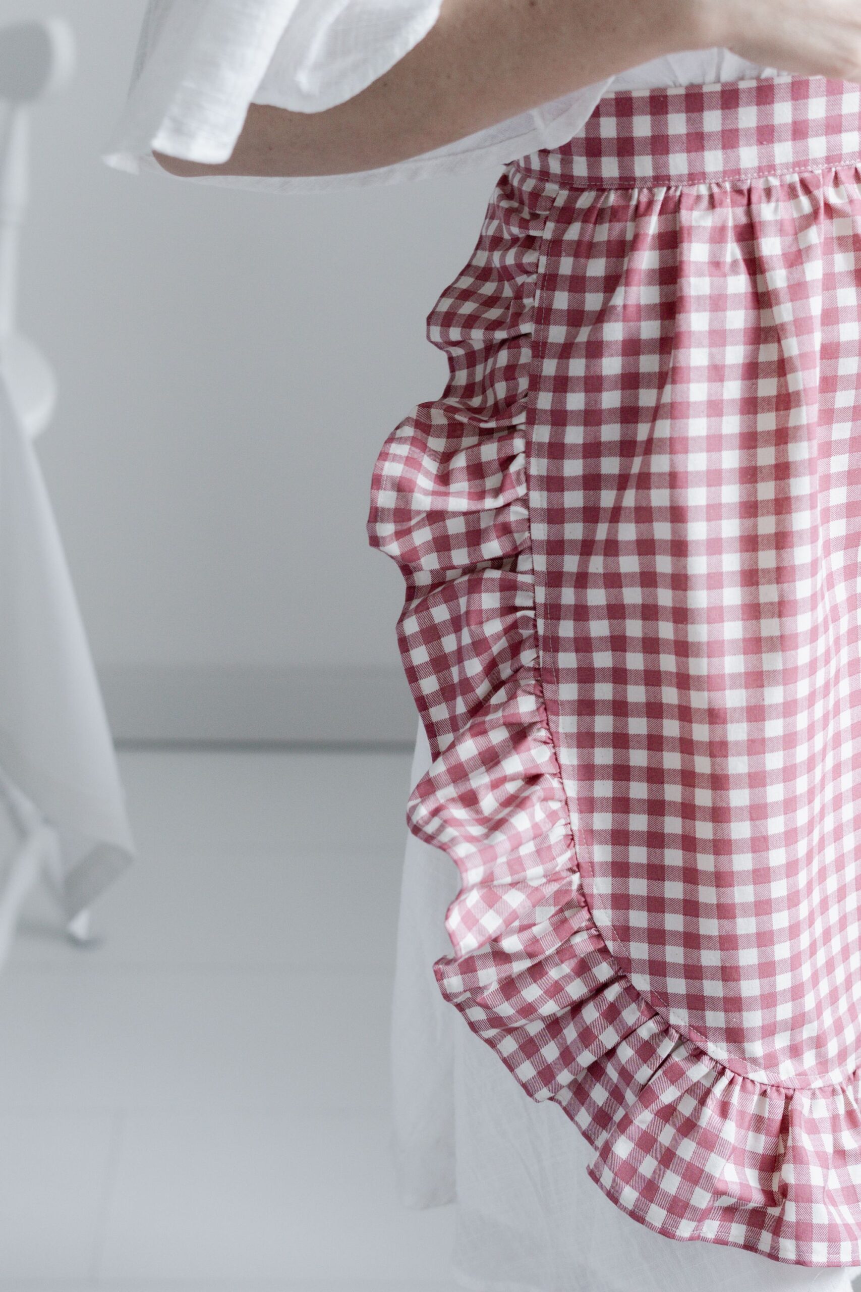 • Krótki fartuch „Classic Vintage Petite”z najwyższej certyfikowanej bawełny w kolorze czerwonej kraty Vichy,